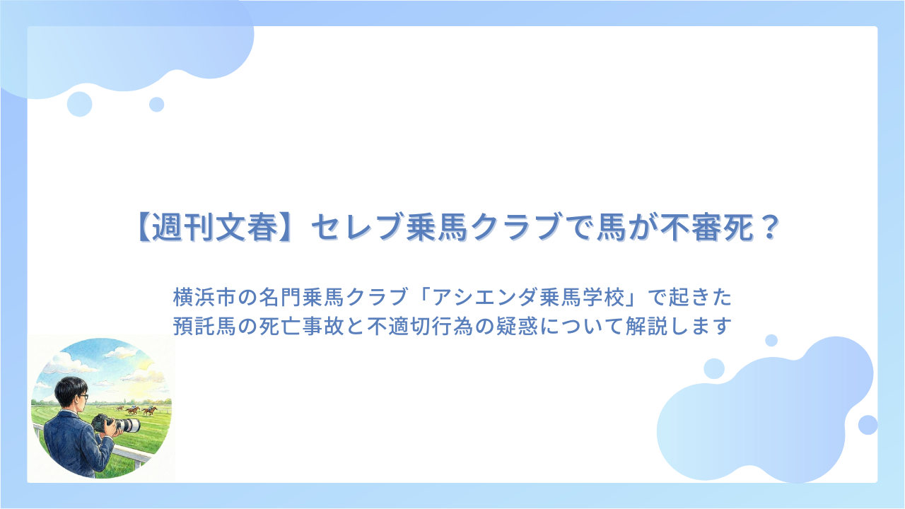 神奈川県横浜市にある名門乗馬クラブ「アシエンダ乗馬学校」において、預託馬の死亡事故や不適切な管理体制があったとする疑惑が『週刊文春』によって報じられ、乗馬ファンや競馬ファンの間で大きな波紋を呼んでいます。